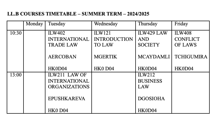 LL.B Law Courses Timetable – Summer Term 2024/2025